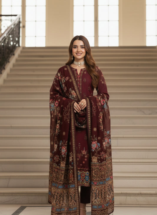Sale price Rs.3,900.00 PKRExude timeless grace with our signature deep burgundy ensemble. This 3-piece masterpiece is meticulously crafted on premium fabric, featuring delicate floral embroidery that whispers luxury. The rich, wine-colored palette is perfectly complemented by an intricately printed dupatta, making it the ultimate choice for evening soirees and festive gatherings. Key Features: Fabric: Ultra-soft premium lawn/khaddar (specify based on your actual material). Shirt: Detailed floral motifs with... -