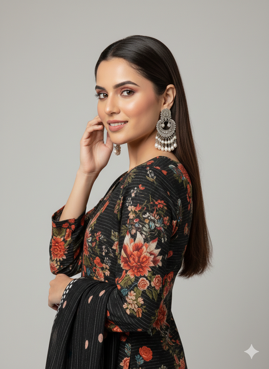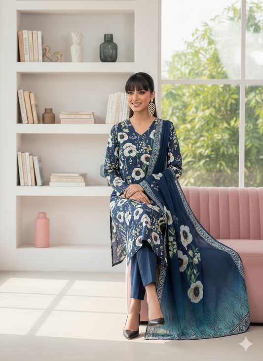 Sale price Rs.3,899.00 PKRProduct Title Azure Poppy – Premium Digital Print 3-Piece Ensemble (Alternative: Midnight Indigo Floral Luxe Suite) Product Description The Art of Timeless Contrast. Make a bold statement with our Azure Poppy ensemble, a stunning 3-piece set that blends deep midnight tones with vibrant botanical artistry. Featuring a rich indigo base, the shirt and dupatta are adorned with striking white and peach poppy motifs, creating a...