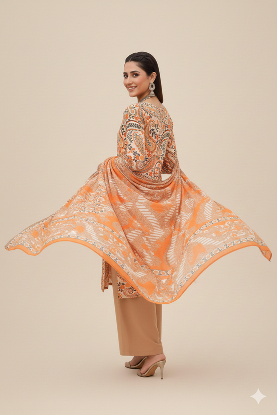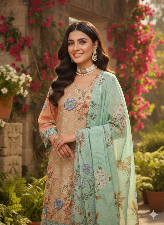 Sale price Rs.5,100.00 PKRElevate your seasonal wardrobe with this exquisitely crafted 3-piece ensemble. Featuring a harmonious blend of soft peach and refreshing mint green, this suit is designed for the modern woman who appreciates traditional elegance with a contemporary twist. Shirt: Premium digital printed lawn shirt featuring intricate floral motifs and a detailed border design on the hem and sleeves. Dupatta: Lightweight, flowing lawn dupatta in a soft... -