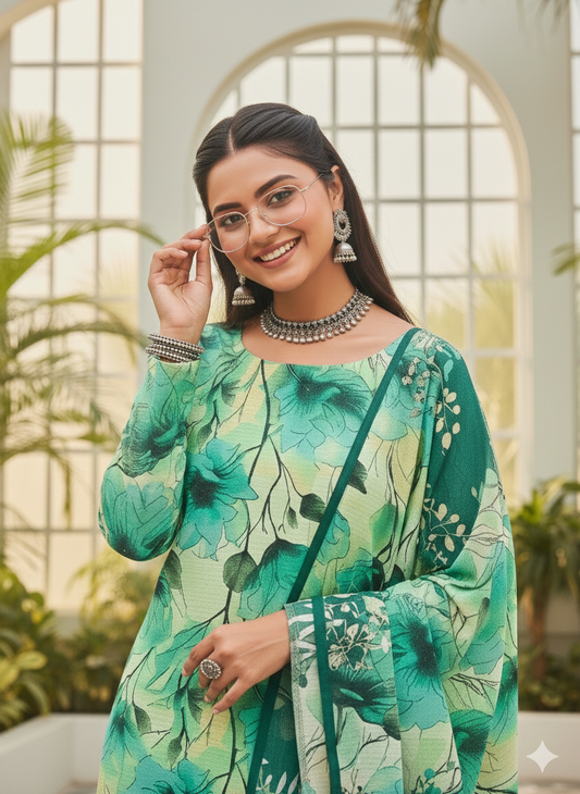 Sale price Rs.4,000.00 PKRStep into the season with the vibrant energy of our "Emerald Bloom" collection. This ensemble features a refreshing palette of mint and deep teal, designed for the modern woman who loves a fusion of contemporary prints and traditional silhouettes. Shirt: Premium breathable lawn featuring large-scale digital floral illustrations in shades of teal, forest green, and sunshine yellow. Dupatta: Lightweight, flowy matching dupatta with an all-over... -