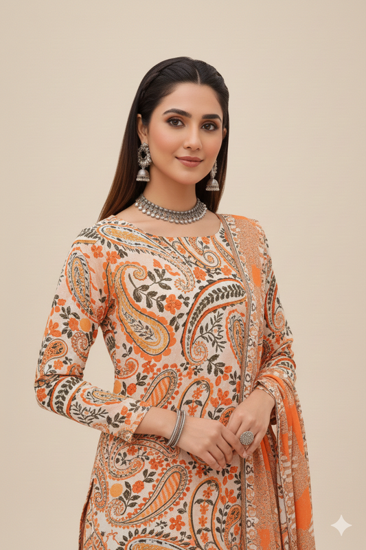 Sale price Rs.3,899.00 PKRUpgrade your everyday wardrobe with this **SS Nishat Orange Printed 3PC Unstitched Suit**—a fresh, wearable color with an elegant print that you can stitch in your own style for a perfect fit. Product Details - Type: 3PC Unstitched Suit - Color: Orange - Design: Printed - Shirt: Unstitched - Trouser: Unstitched - Dupatta: Included What’s Included- Shirt fabric: Unstitched - Trouser fabric: Unstitched - Dupatta:... -