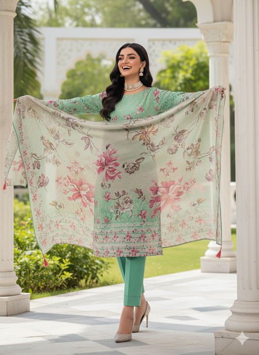 Sale price Rs.5,000.00 PKRFreshness in Every Detail. Step into a world of serene elegance with our Mint Gardenia ensemble. This 3-piece set features a refreshing mint green base brought to life with a romantic bouquet of pink and purple floral digital prints. Designed for the modern woman who values both comfort and high-fashion aesthetics, this look is as breathable as it is beautiful. Key Features: Fabric: Premium, lightweight... -
