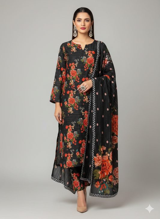 Rs.4,500.00 PKRSale price Rs.3,999.00 PKRophistication in Every Stitch. Embrace the allure of deep, cool tones with this exquisite midnight blue ensemble. This 3-piece set is a masterclass in contemporary ethnic wear, featuring a rich indigo base elevated by vibrant, artistic floral digital prints. The shirt is detailed with refined embroidery along the neckline, perfectly balancing traditional craftsmanship with a modern aesthetic. Key Features: Fabric: High-quality, breathable premium fabric designed...Sale -